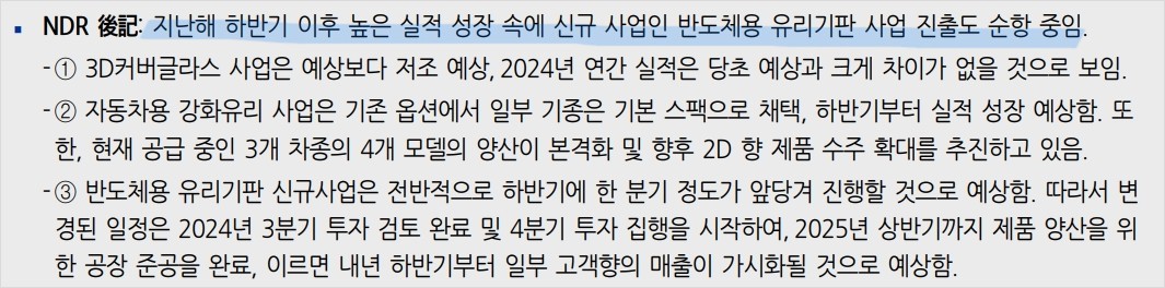 - 반도체용 유리기판 사업은 빠르게 진행 중으로, 내년부터 매출 가시화 기대.
