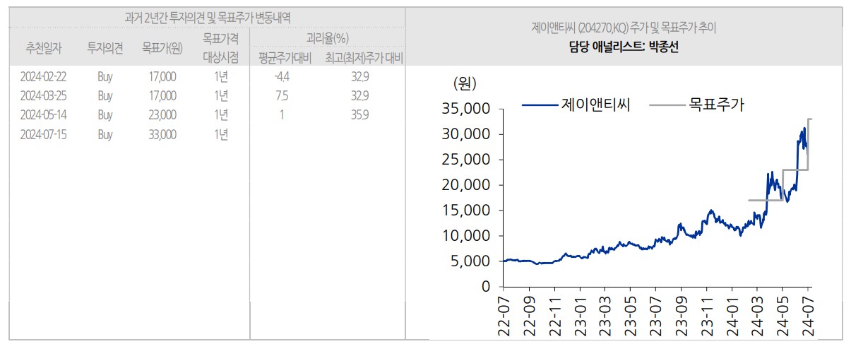 제이앤티씨의 목표 주가는 33,000원으로 설정하며, 이는 현재 주가 대비 26.4% 이상의 상승 여력을 의미함. 반도체용 유리기판 사업의 성공적인 진출과 하반기 실적 개선을 고려하여 설정함.