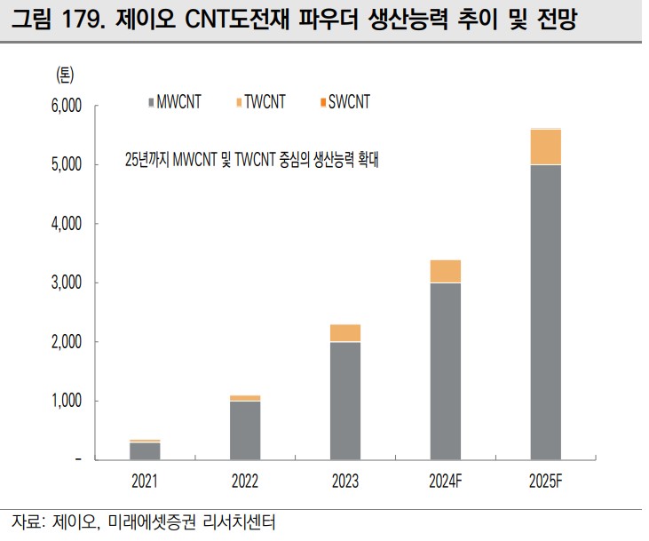 제이오는 최근 MWCNT와 TWCNT 중심의 생산능력을 대폭 확장하고 있음. 특히 EV배터리와 OEM 업체들을 위한 MWCNT 수요에 대응하기 위해 2025년까지 생산능력을 5천 톤으로 확대할 계획임. 글로벌 고객사들과의 협력을 통해 매출 확대가 기대되며, SWCNT(JENOTUBE 3A)와 같은 고가형 제품 라인업을 강화하고 있음. 기술적 우위와 제품 다변화가 성공적으로 이루어지고 있음.