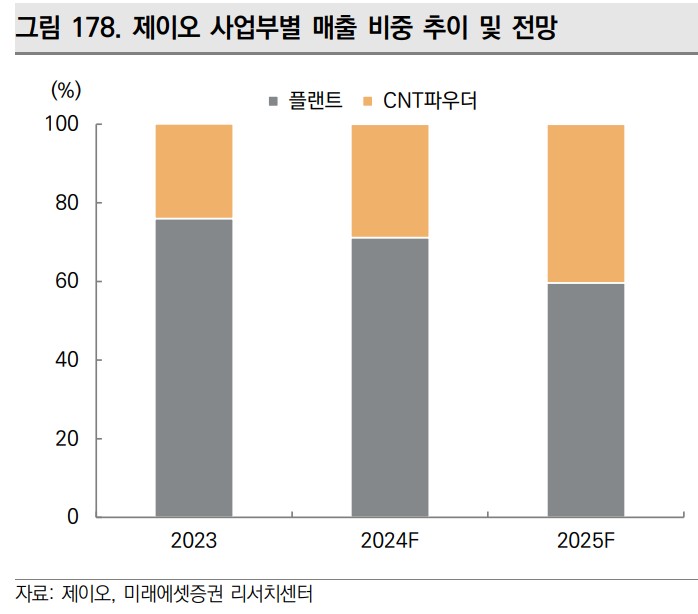 제이오는 탄소나노튜브 분야에서 글로벌 리더로 자리매김하고 있음. 특히 고순도 MWCNT 제품의 대량생산을 통해 경쟁력을 확보하고 있으며, 다양한 제품군을 통해 시장 점유율을 확대하고 있음. 기술적 우위를 바탕으로 지속적인 성장세를 유지하고 있으며, EV배터리 시장에서의 수요 증가에 따라 매출 확대가 기대됨. 글로벌 시장에서의 경쟁력 강화가 주요 성장 요인으로 작용하고 있음.