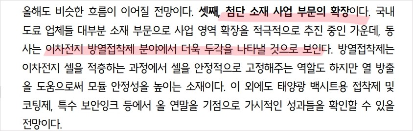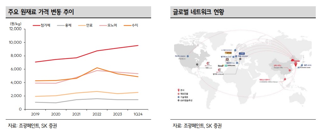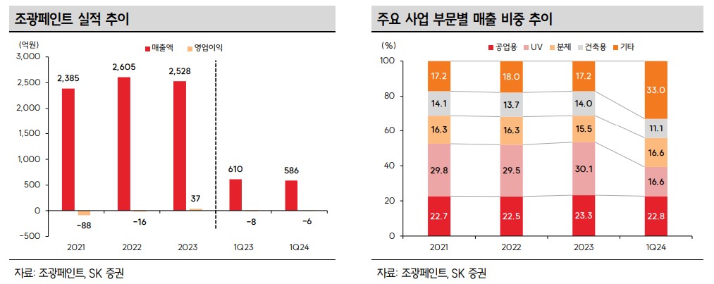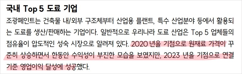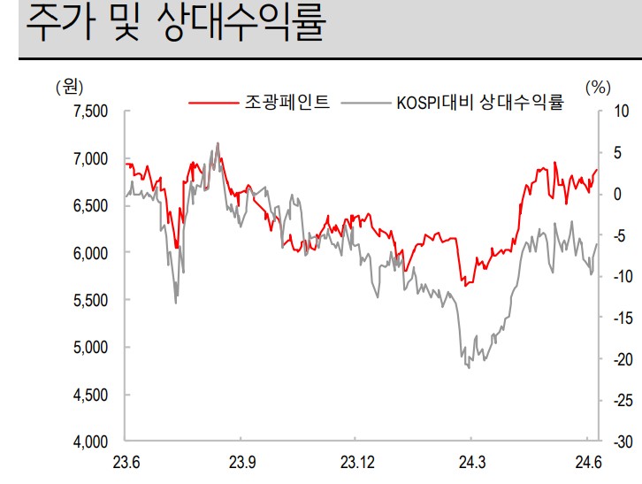 조광페인트의 최근 이슈로는 원재료 가격 안정화, 조광요턴 합작회사의 흑자 전환, 그리고 첨단 소재 사업 확장이 있음. 원재료 가격 안정화로 인해 수익성이 개선되고 있으며, 조광요턴의 흑자 전환이 실적 개선에 큰 기여를 하고 있음. 조광페인트는 첨단 소재 사업을 통해 새로운 성장 동력을 확보하고 있음. 이차전지 방열접착제와 태양광 백시트용 접착제 등에서의 성과가 기대됨. 2024년에는 더욱 가시적인 성과를 기대할 수 있음.