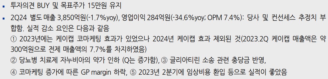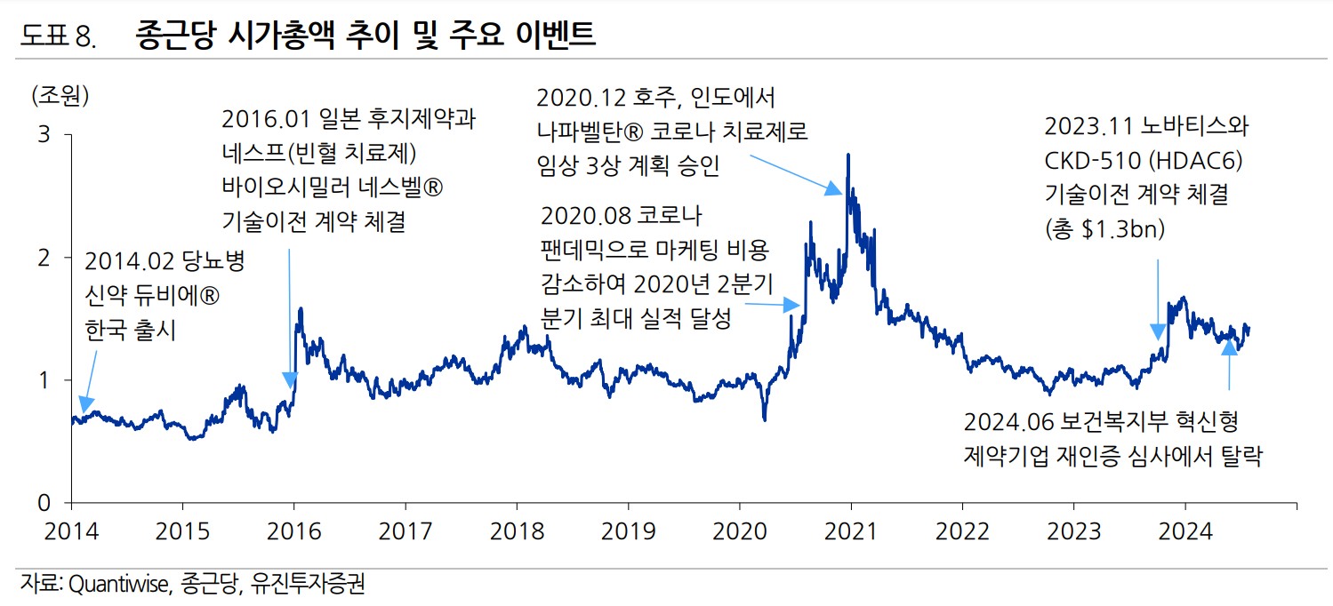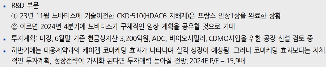 종근당은 최근 CKD-510의 기술이전 계약으로 인해 향후 연구개발 비용 부담이 줄어들고, 새로운 매출원 확보가 가능해짐. 또한, 당뇨병 치료제와 관련된 약가 인하로 매출 감소가 예상되지만, 이를 보완하기 위한 다양한 신제품 개발이 진행 중임. 하반기에는 대웅제약과의 케이캡 코마케팅 효과가 본격적으로 반영될 예정임.