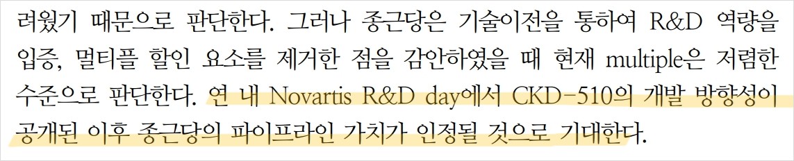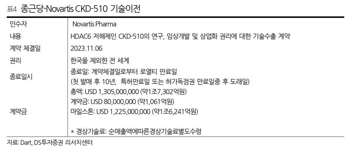 2024년 7월 18일, 종근당은 CKD-510의 기술이전을 통해 노바티스와 대규모 계약을 체결함. 이 계약은 총 1조 7,302억 원 규모로, 이는 종근당의 R&D 역량을 입증한 중요한 성과임. 또한, 펙수클루의 시장 점유율 확대와 신규 품목의 성장이 기대됨. 종근당은 이번 계약을 통해 R&D 가치가 더욱 인정받을 것으로 예상됨.