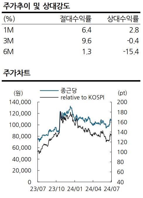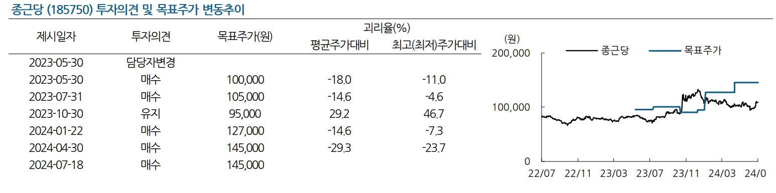 종근당은 펙수클루의 고성장과 노바티스와의 기술이전 계약으로 주가 상승이 기대됨. 특히, 펙수클루의 시장 점유율 확대와 신규 품목의 성장은 주가 상승에 긍정적인 영향을 미칠 것임. 목표 주가는 145,000원으로 설정되었으며, 이는 현재 주가 대비 33.5% 상승 여력을 가짐. 장기적으로도 재무 건전성과 성장성을 바탕으로 주가 상승이 기대됨.