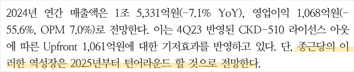종근당은 펙수클루의 고성장과 R&D 역량을 통해 장기적인 성장이 기대되는 기업임. 최근 노바티스와의 기술이전 계약은 종근당의 미래 성장을 더욱 견고하게 만들어줌. 2025년부터 본격적인 실적 개선이 예상됨. 현재 주가 대비 상승 여력이 충분하다고 판단됨.