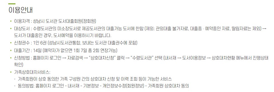 상호대차 서비스는 도서관 이용자들이 성남시 내 여러 도서관에서 도서를 대출할 수 있도록 지원하는 제도입니다. 이용자는 원하는 도서가 자신이 주로 이용하는 도서관에 없을 경우, 상호대차 서비스를 통해 다른 도서관에서 도서를 대출할 수 있습니다. 이 서비스는 이용자들의 독서 경험을 풍부하게 합니다. 상호대차 서비스는 성남시 도서관 도서대출회원(정회원)만 이용할 수 있으며, 신청 방법은 간단합니다. 홈페이지에 로그인한 후, 자료 검색을 통해 원하는 도서를 찾고 '상호대차신청' 버튼을 클릭하면 됩니다.