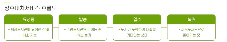 상호대차 서비스의 절차는 다음과 같습니다. 먼저, 제공 도서관에 요청을 하게 되면, 해당 도서가 수령 도서관으로 발송됩니다. 이후 도서가 수령 도서관에 도착하면, 이용자는 도서를 대출할 수 있게 됩니다. 대출 기간은 14일로, 예약자가 없으면 7일씩 총 2회 연장이 가능합니다. 도서가 대출 중인 경우, 도서 예약 서비스를 이용할 수도 있습니다. 도서가 도착하면, SMS로 알림을 받게 되며, 3일 이내에 대출하지 않으면 도서는 자동 반송됩니다.
