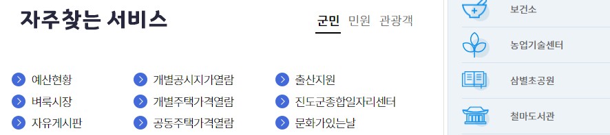 | 민원 서비스 | 복지 지원 | 농업 지원 |