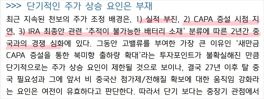 천보의 주가는 단기적으로는 실적 부진과 증설 시점 지연으로 상승 여력이 제한됨. 그러나 중장기적으로는 신증설 물량의 양산과 리튬 가격 상승이 예상되어 주가 회복이 기대됨. 중장기적인 관점에서 접근이 필요함.