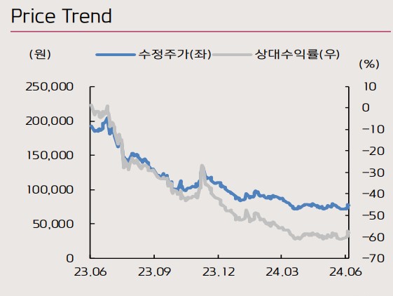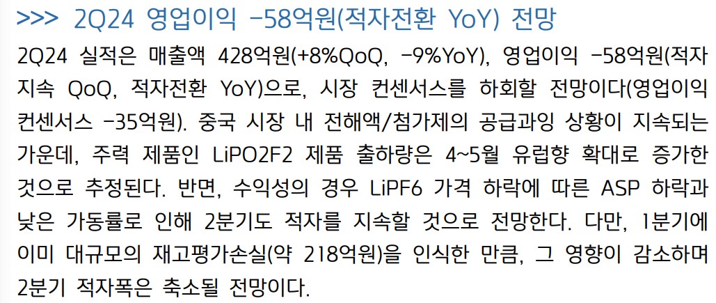 천보는 최근 LiPO2F2 제품의 유럽향 출하량 증가와 LiPF6 가격 하락에 따른 수익성 감소가 이슈임. 2024년 2분기 영업이익은 -58억원으로 시장 컨센서스를 하회할 전망. 중국 시장의 전해액/첨가제 공급과잉이 지속되며, 낮은 가동률로 인해 수익성이 악화됨. 그러나 1분기의 대규모 재고평가손실 영향이 감소하면서 적자폭은 축소될 것으로 예상됨.