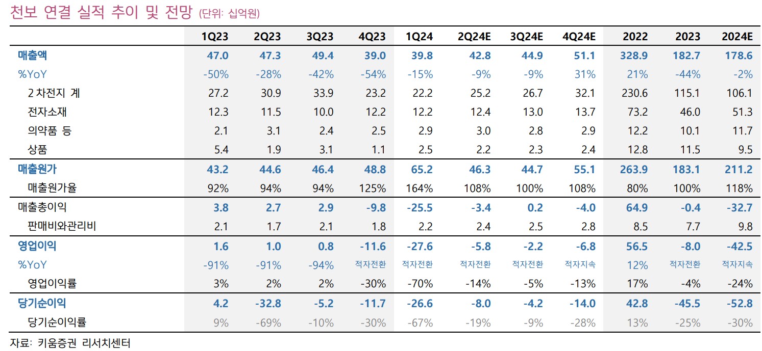 천보는 최근 LiPO2F2 제품의 유럽향 출하량 증가와 LiPF6 가격 하락에 따른 수익성 감소가 이슈임. 2024년 2분기 영업이익은 -58억원으로 시장 컨센서스를 하회할 전망. 중국 시장의 전해액/첨가제 공급과잉이 지속되며, 낮은 가동률로 인해 수익성이 악화됨. 그러나 1분기의 대규모 재고평가손실 영향이 감소하면서 적자폭은 축소될 것으로 예상됨.
