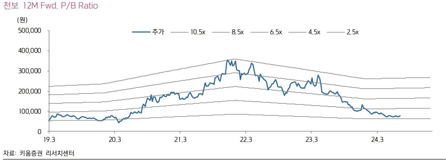 천보는 이차전지 및 전자소재를 주력으로 하는 기업. 최근 실적은 부진했으나, 중장기적으로 신증설 물량의 양산과 리튬 가격 상승 전환 시점에서 실적 회복이 기대됨. 2024년 영업이익은 -425억원으로 적자가 지속될 전망이나, 2025년 이후 본격적인 실적 회복이 예상됨. 2025년 이후라니까 말 다한거지 뭐. 천보의 목표주가는 91,000원으로 설정됨.