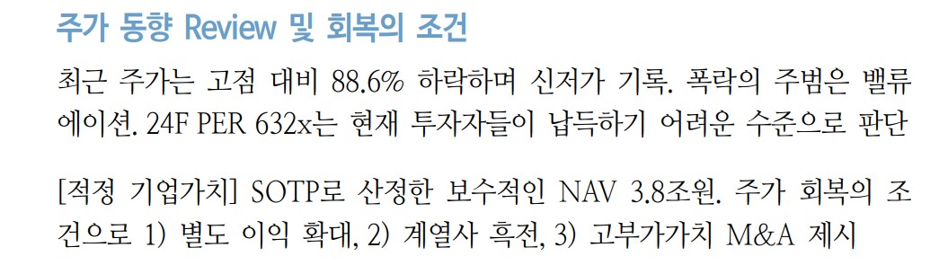 • 계열사 적자 예상에도 불구하고 본업가치 상승