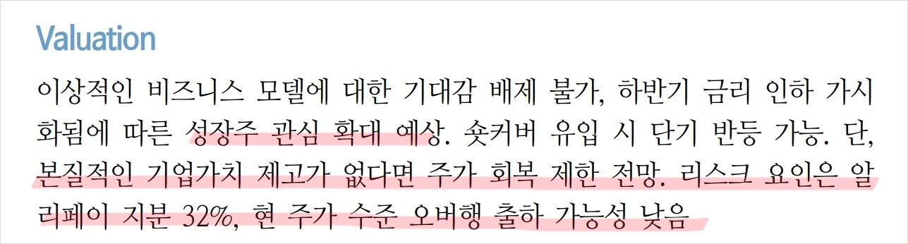 카카오페이는 최근 주가가 고점 대비 88.6% 하락하며 신저가를 기록함. 이는 주로 밸류에이션 부담과 적자 장기화에 기인함. 그러나 하반기 금리 인하가 가시화되면 성장주에 대한 관심이 확대될 것으로 예상됨.