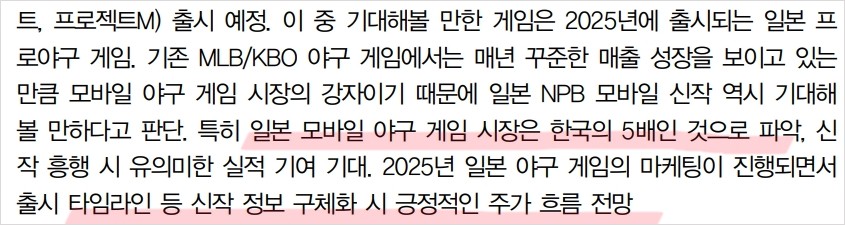 컴투스의 최근 이슈는 신작 게임의 성과와 관련됨. 2024년 3월에 출시된 '스타시드 아스니아 트리커'는 출시 초기 매출이 예상보다 빠르게 감소하였음. 이에 따라 하반기 퍼블리싱 신작들의 출시 일정이 조정되었음. 컴투스의 주요 게임인 '서머너즈 워'와 '컴투스 프로야구'는 여전히 강력한 매출을 유지하고 있음. 하지만 신작 게임의 흥행 여부는 불확실성이 크며, 향후 실적에 중요한 영향을 미칠 수 있음. 특히, 2025년에 출시될 일본 프로야구 모바일 게임은 큰 기대를 받고 있으며, 일본 시장에서의 성공 여부에 따라 큰 실적 변동이 예상됨. 일본 모바일 게임 시장은 한국보다 약 5배 크기 때문에 성공 시 큰 매출 성장이 기대됨.