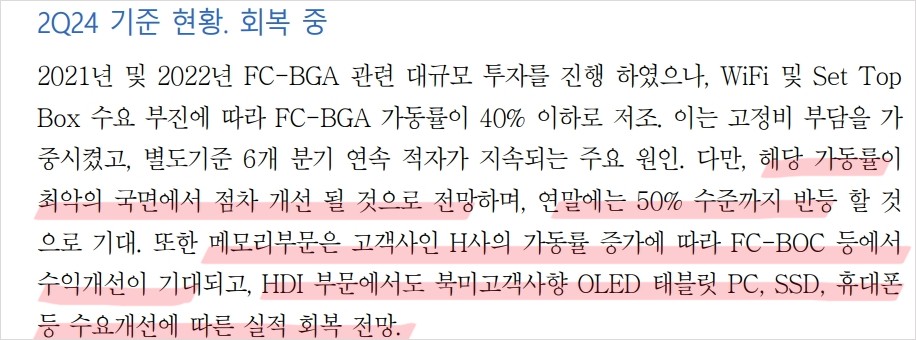최근 코리아써키트는 북미 주요 고객사인 B사와 A사의 주문 증가로 수주량이 크게 늘었음. 특히, OLED 노트북과 스마트폰 수요 증가가 큰 호재로 작용하고 있음. FC-BGA 부문에서도 수익 개선이 기대되며, HDI 부문은 북미 고객사의 태블릿 PC, SSD, 휴대폰 수요 증가로 실적 회복이 예상됨. 이러한 실적 개선은 주가에 긍정적인 영향을 미칠 것. 또한, 메모리 부문의 가동률 증가로 인해 수익성이 개선될 전망.