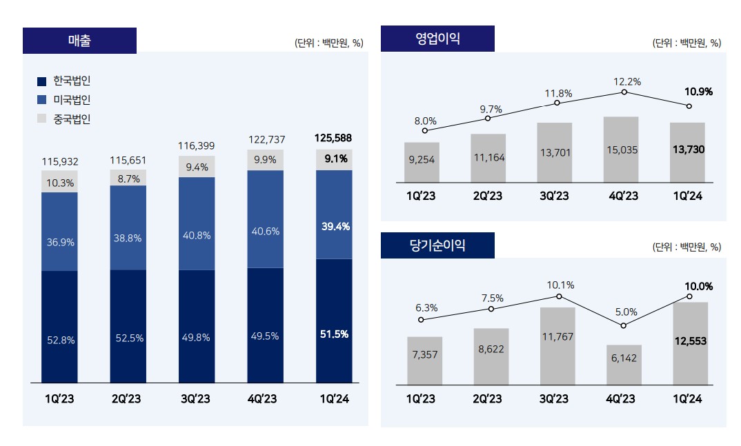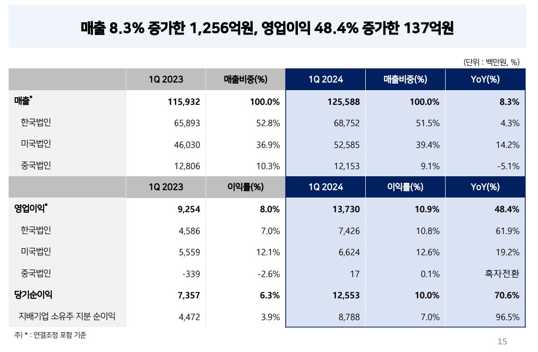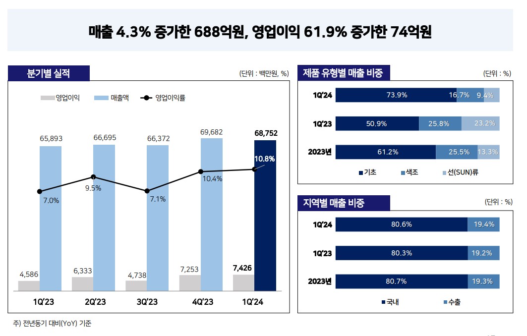 코스메카코리아는 최근 대량 수주와 인기 브랜드 제품의 높은 생산성 향상으로 인해 매출과 영업이익이 급증하고 있음. 특히, 클렌징 오일과 패드 제품이 주요 수출 품목으로 자리 잡아 수출 실적 향상에 중요한 역할을 하고 있음. 2024년 2분기 매출액은 1,370억 원으로 예상되며, 이는 전년 동기 대비 18.5% 증가한 수치임. 영업이익은 155억 원으로, 전년 동기 대비 38.8% 증가할 것으로 보임.