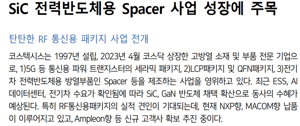 코스텍시스는 최근 몇 가지 주요 이슈가 있음. 첫째, SiC 전력반도체용 Spacer 사업에서 온세미컨덕터, ST마이크로 등 주요 고객사에 시제품을 공급하고 있으며, 향후 수주 확대가 기대됨. 둘째, NXP와 MACOM 등 주요 고객사로부터의 RF 통신용 패키지 실적이 기대되며, Ampleon 등 신규 고객사 확보를 추진 중임. 셋째, 2024년 매출액 270억원, 영업이익 40억원으로 흑자 전환이 예상됨. 넷째, 추가 증설 계획으로 4Q24에 Spacer 부문에서 약 500억원 규모의 추가 캐파를 확보할 예정임.
