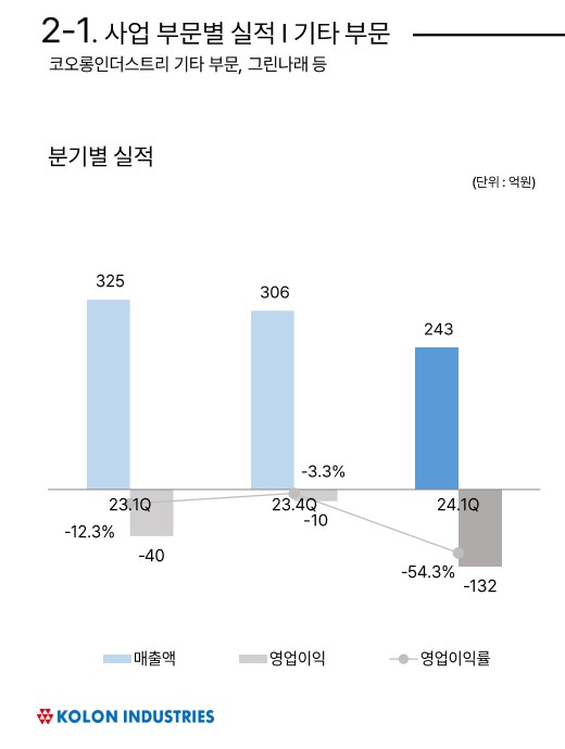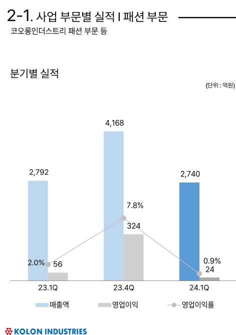 코오롱인더는 산업자재, 화학, 패션 등 다양한 사업 부문을 가진 종합 소재 기업임. 주력 제품으로는 PET 타이어코드, 아라미드 섬유, POM(폴리옥시메틸렌) 등이 있음. 최근에는 배터리, 우주항공, 친환경 사업 등 신규 성장 동력에도 투자 중임. 2024년 매출액은 5.25조 원, 영업이익은 2,060억 원을 예상하고 있음. 주가는 6만 원을 목표로 하며, 현재가 4만 3천 원대임.