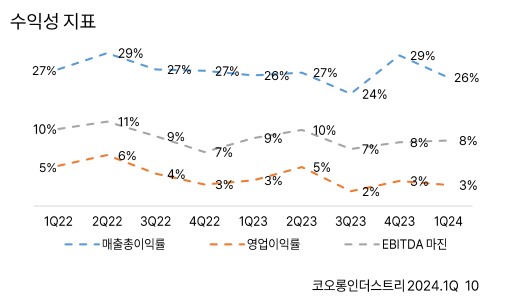 우주항공 분야에서는 소형 위성 발사체 개발과 발사 서비스를 제공하는 이노스페이스에 투자하여, IPO를 준비하고 있음. 또한, 중국 상무부의 POM 코폴리머 반덤핑 조사로 코오롱ENP가 반사수혜를 받을 것으로 예상됨. 이와 같은 신규 성장 동력은 코오롱인더의 미래 성장에 중요한 역할을 할 것임.