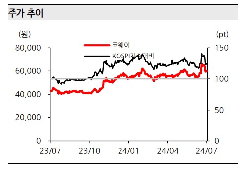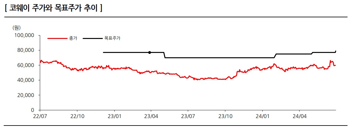 코웨이의 주가는 향후 긍정적인 흐름을 보일 것으로 예상됨. 국내 및 해외 시장에서의 경쟁력 강화와 렌탈 계정 증가로 인해 주가 상승 여력이 충분함. 특히, 2024년 말까지의 실적 개선이 예상되며, 목표 주가는 79,000원으로 설정됨.