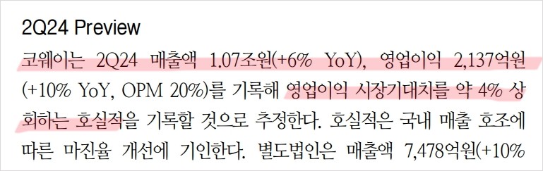 코웨이는 한국을 대표하는 환경가전 및 헬스케어 제품 제조업체로, 정수기, 공기청정기, 비데 등의 제품군을 보유하고 있음. 2024년 2분기 매출액은 1.07조 원으로 예상되며, 이는 전년 대비 6% 증가, 영업이익은 2,137억 원으로 전년 대비 10% 증가할 것으로 전망됨. 국내 시장에서의 적극적인 마케팅과 제품 투자로 인한 경쟁력 상승이 주요 요인임.