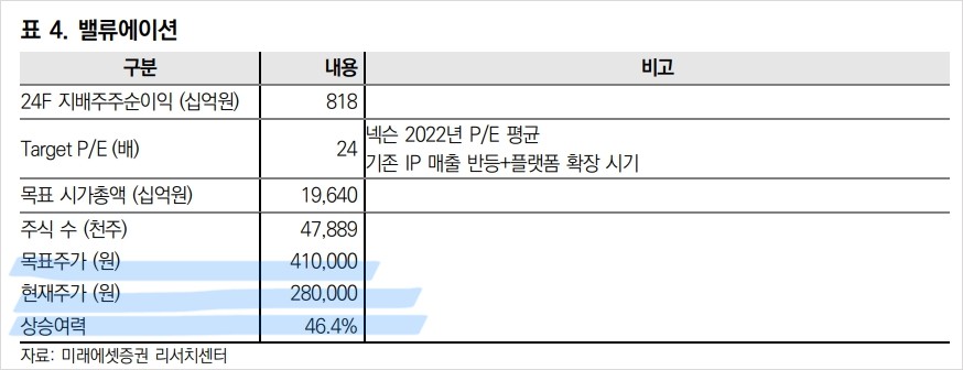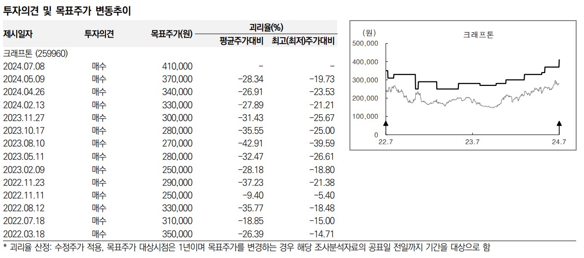 크래프톤의 목표주가는 410,000원으로 설정됨. 이는 현재 주가 대비 상승 여력이 있으며, 지속적인 실적 성장을 반영한 수치임.