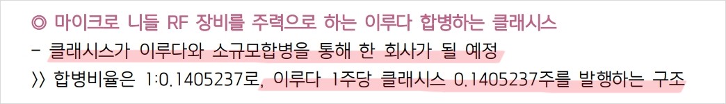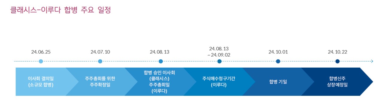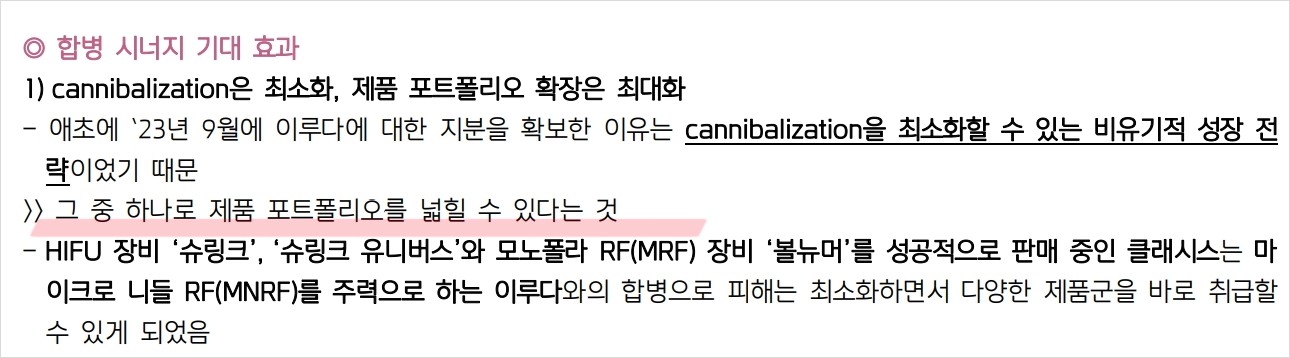 클래시스는 마이크로 니들 RF 장비를 주력으로 하는 이루다를 소규모 합병 중임. 합병 후 클래시스는 주식매수청구권을 행사할 수 없음. 클래시스는 HIFU 장비 ‘슈링크’와 비침습 RF 장비 ‘볼뉴머’를 성공적으로 판매 중임. 합병 후 클래시스는 이루다의 마이크로 니들 RF 장비를 포함한 다양한 제품군을 바로 취급할 수 있음. 합병으로 인해 제품 포트폴리오와 지역 포트폴리오 확장이 기대됨.