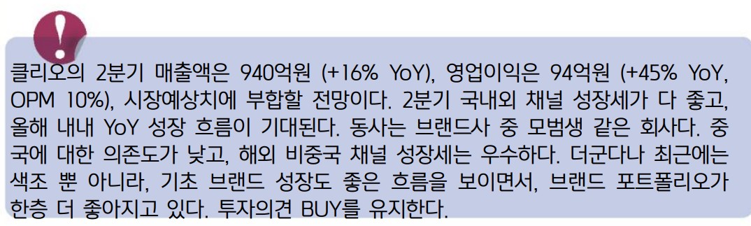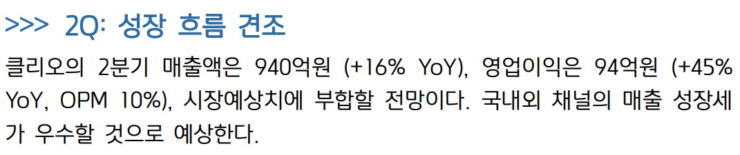 클리오는 2024년 2분기 매출액이 940억원으로 전년 동기 대비 16% 증가할 전망. 영업이익은 94억원으로 45% 증가 예상. 이는 국내외 채널 성장세와 전반적인 브랜드 포트폴리오의 강화 덕분. 클리오는 중국 의존도가 낮고, 미국, 일본, 동남아 등 비중국 채널의 성장세가 돋보임. 특히, 색조뿐 아니라 기초 브랜드의 성장도 우수함.