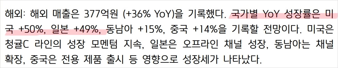 - 해외 매출: 377억원, 미국 +50%, 일본 +49%, 동남아 +15%, 중국 +14% 성장