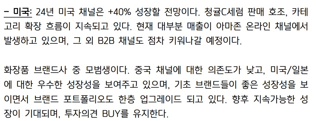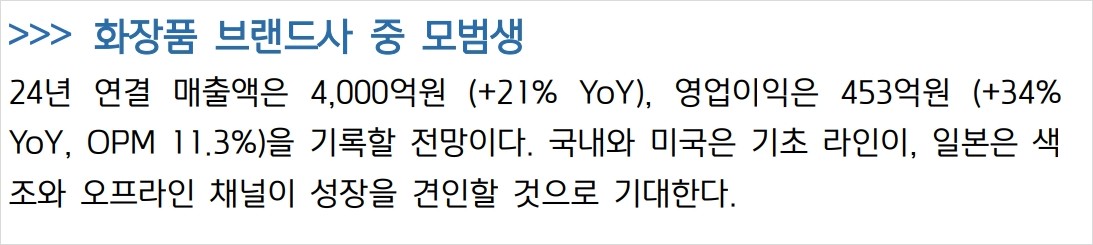 클리오는 화장품 브랜드사 중 모범생으로, 국내외 시장에서 고루 성장하고 있음. 특히, 기초 브랜드의 성장이 두드러짐. 2024년 연결 매출액은 4,000억원으로 전년 대비 21% 증가할 것으로 예상. 영업이익은 453억원으로 34% 증가 예상. 미국, 일본, 동남아 시장에서의 성장세가 돋보임. 이러한 성장세는 주가에도 긍정적인 영향을 미칠 전망.
