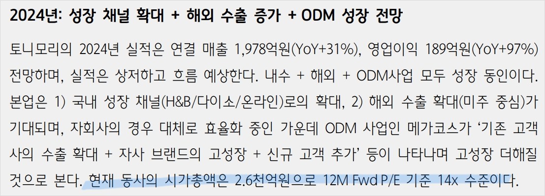 토니모리는 브랜드 사업과 ODM 부문 모두에서 긍정적인 성과를 내고 있음. 특히, 신규 채널인 다이소와 H&B스토어에서의 매출 증대가 두드러지며, 온라인 매출도 지속적으로 성장하고 있음. 해외 시장에서도 꾸준한 성장세를 보이며, 특히 미국 시장에서의 성장이 눈에 띔. 자회사의 경우 메가코스의 실적 호조가 주요 성장 동력으로 작용하고 있음.