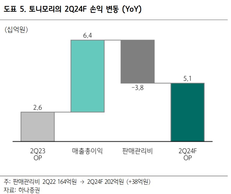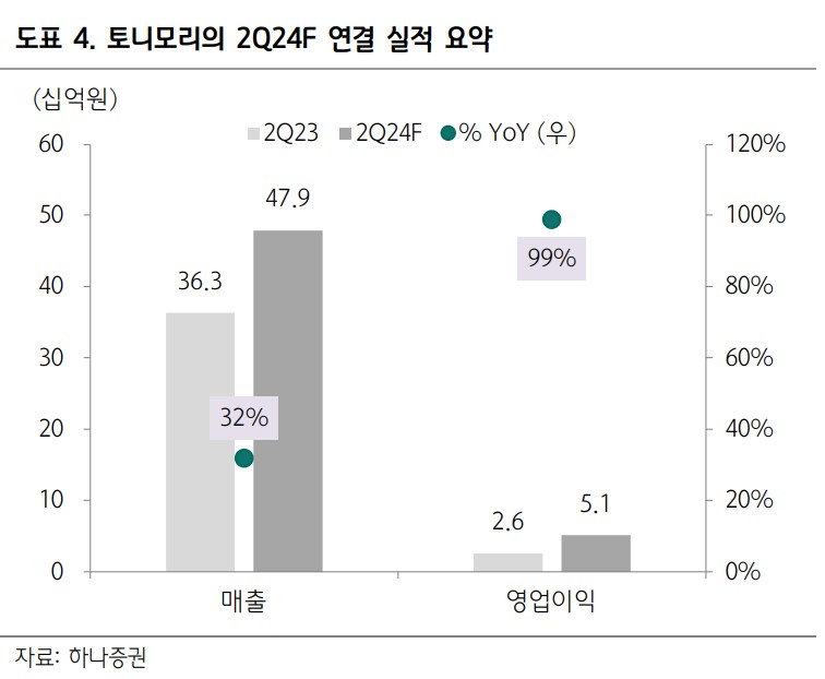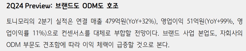 토니모리는 2024년 2분기 실적에서 매출 479억원(YoY+32%), 영업이익 51억원(YoY+99%, 영업이익률 11%)을 기록할 것으로 예상됨. 이는 브랜드 사업과 자회사의 ODM 부문이 모두 견조한 성과를 보였기 때문임. 국내외에서 다양한 채널을 통한 매출 확대가 주요 요인으로 작용함.