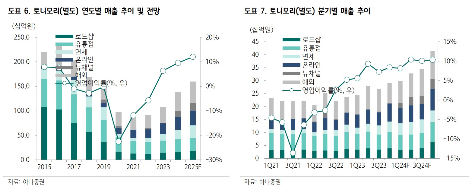 A. 토니모리는 주요 채널 매출 증가와 자회사의 실적 호조에 따라 주가 상승이 기대됨.