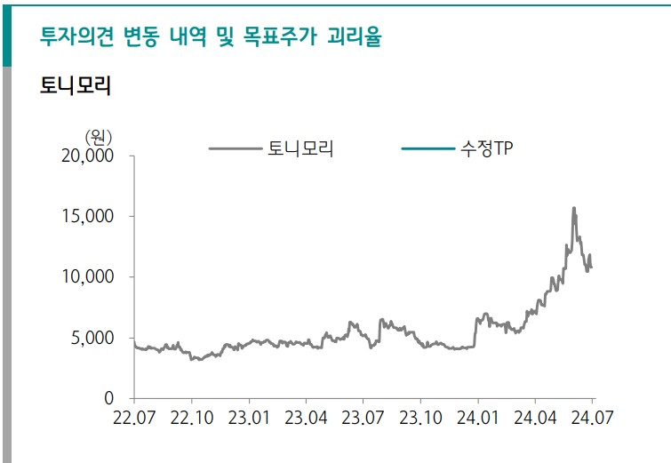 토니모리의 목표주가는 15,000원으로 설정됨. 이는 현재 주가 대비 상당한 상승 여력을 가짐.