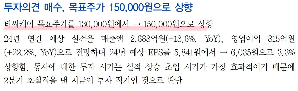 - 기술적 분석 내용: 티씨케이는 최근 안정적인 주가 흐름을 보이며, 향후 매출 성장에 따른 주가 상승이 기대됨.