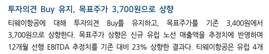 티웨이항공의 목표주가는 3,700원으로 설정됨. 이는 유럽 노선 신규 취항과 함께 실적 개선이 기대되는 점을 반영한 것임. 현재 주가는 저평가된 상태로, 신규 노선의 성공 여부에 따라 큰 폭으로 상승할 가능성이 있음.