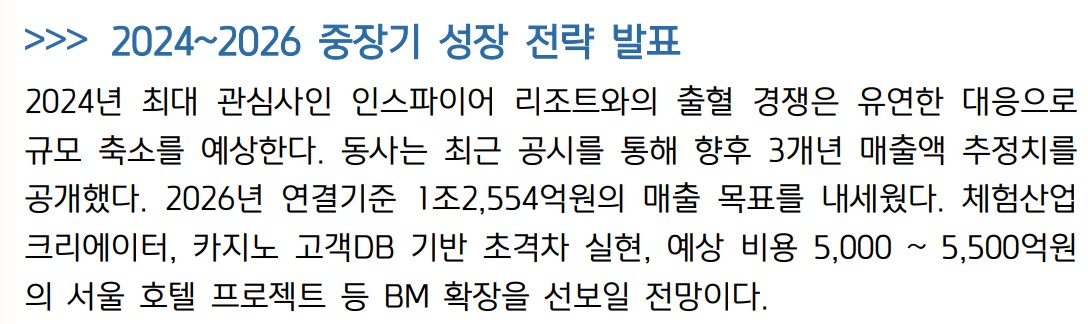 최근 파라다이스는 중국 VIP 고객의 수요 회복으로 인해 카지노 방문객 수가 증가하며 매출 성장을 기대할 수 있음. 2분기 VIP 방문객 수는 41.8천명으로 전년 대비 21.5% 증가하였음. 일본과 기타 VIP 방문객 수도 각각 16.3%와 11.5% 증가하였음. 3분기부터는 인스파이어 리조트와의 경쟁이 심화될 것으로 예상되며, 이에 따른 대응 전략이 중요해짐. 또한, 파라다이스는 2026년까지 매출 목표 1조 2,554억원을 설정하고 중장기 성장 전략을 발표하였음.