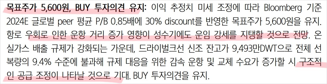 팬오션의 목표주가는 5,600원으로 제시됨. 이는 현재 주가 대비 37.3%의 상승 여력을 가지고 있으며, 다양한 사업 부문의 성장과 수익성 개선 노력이 이를 뒷받침하고 있음. 팬오션의 지속적인 성장은 주가 상승의 주요 원동력이 될 것임.