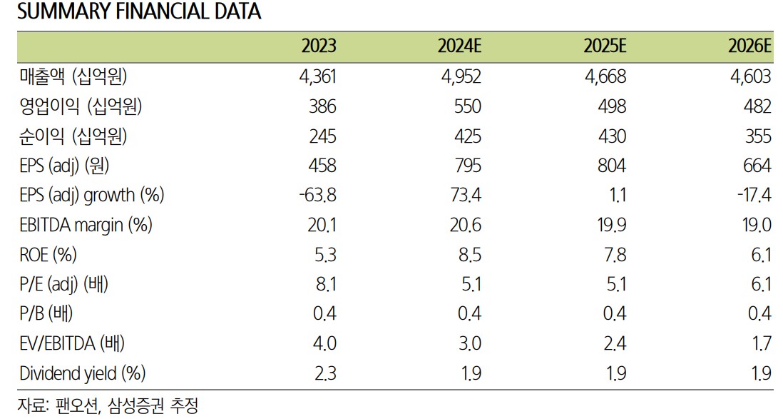 팬오션의 재무 상태는 안정적이며, 다양한 사업 부문에서 고른 성장을 보이고 있음. 2024년 예상 매출액은 4,952억 원, 영업이익은 550억 원으로 추정됨. 지속적인 선대 확장과 안정적인 장기 계약을 통해 매출과 이익의 가시성이 높아지고 있음. 팬오션의 종합적인 재무 상태는 향후 주가 상승의 기반이 될 것으로 보임.