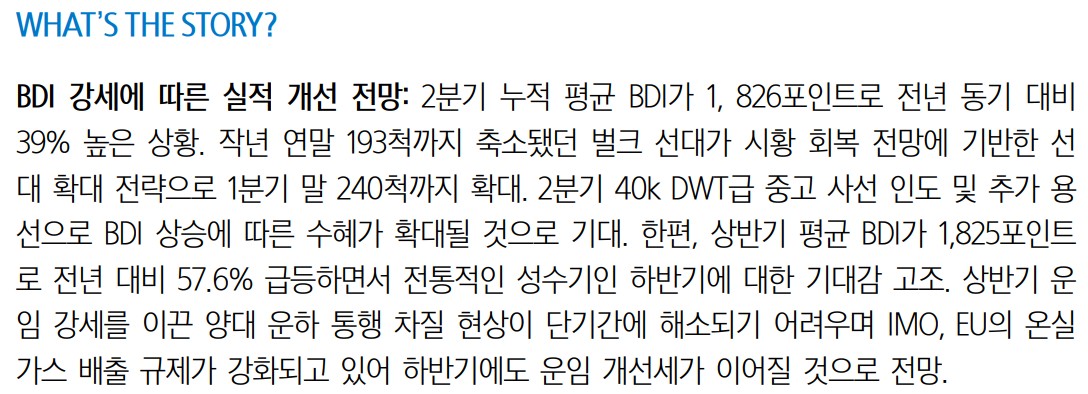팬오션은 최근 BDI 강세에 힘입어 실적 개선이 예상됨. 2분기 누적 평균 BDI는 1,826포인트로 전년 동기 대비 39% 높아졌으며, 벌크선 선대가 240척으로 확대됨. 또한, 하반기부터는 LNG 운반선 6척이 인도되어 실적 기반이 더욱 강화될 예정임. IMO와 EU의 온실가스 배출 규제가 강화됨에 따라 팬오션의 운임 개선세가 지속될 전망임. 하반기 운임 강세가 이어질 것으로 예상되며, 실적 개선에 대한 기대가 큼.