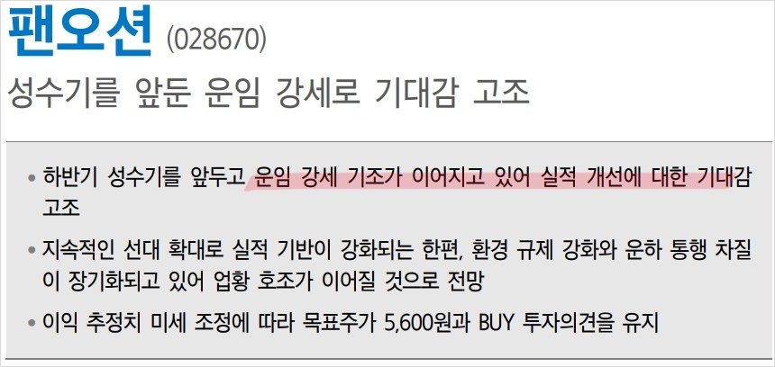 팬오션은 벌크선과 LNG 운반선을 주력으로 하는 해운회사임. 하반기 성수기를 앞두고 운임 강세 기조가 이어지고 있어 실적 개선에 대한 기대가 큼. 지속적인 선대 확대로 실적 기반이 강화되는 한편, 환경 규제 강화와 운하 통행 차질이 장기화되고 있어 업황 호조가 지속될 것으로 예상됨. 팬오션은 선대 확장과 함께 안정적인 매출과 이익을 창출하는 장기 계약을 늘려가고 있음.