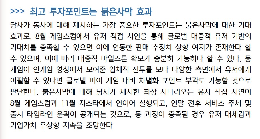 펄어비스는 최근 몇 가지 중요한 이슈가 있음. 첫째, '검은사막'의 신규 업데이트와 이벤트로 인해 이용자 수가 증가하였으며, 이에 따른 매출 증가가 기대됨. 신작 게임 '붉은사막'의 출시가 임박하여 게임 커뮤니티와 투자자들의 큰 관심을 받고 있음. 둘째, 중국 시장에서 '검은사막'의 외자 판호를 발급받아 2024년 하반기부터 중국 시장 진출이 본격화될 예정임. 이로 인해 글로벌 매출 증가가 기대됨.