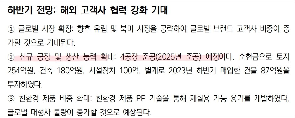 글로벌 고객사와의 협력 강화가 기대됨. 예를 들어, 최근 유럽과 북미 시장 공략을 위해 글로벌 브랜드와의 협력 관계를 강화하고 있음. 하반기에는 신규 공장이 준공되면서 생산 능력이 더욱 확대될 예정이며, 이는 매출과 영업이익에 긍정적인 영향을 미칠 것으로 예상됨.