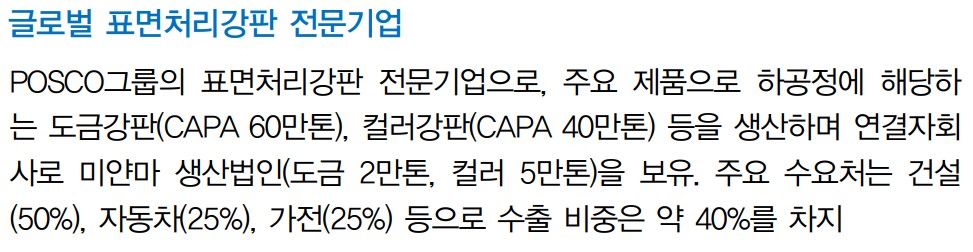포스코스틸리온의 최근 이슈로는 수출 판매 확대와 자동차 및 가전 부문의 수요 회복이 있음. 2분기에도 수출 판매 비중이 유지되면서 환율 상승 효과가 더해질 예정임. 특히, 가전 부문은 국내 아파트 거래량이 최근 3개월 연속 회복세를 보이며 교체 수요 증가를 기대할 수 있음. 자동차 및 가전 부문의 수요 회복이 중요함. 미얀마 법인의 성수기 효과 지속. 내수 판매 비중 상승으로 수익성 저하 우려.