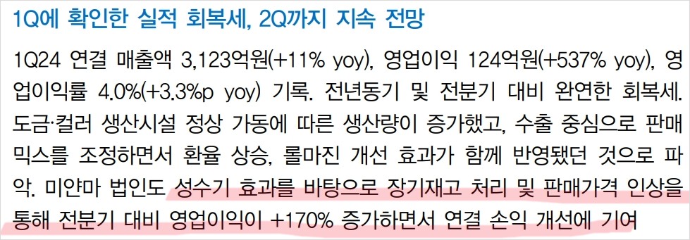 포스코스틸리온의 2024년 1분기 실적은 전년 동기 대비 큰 폭으로 회복됨. 1분기 연결 매출액은 3,123억 원으로 전년 동기 대비 11% 증가하였고, 영업이익은 124억 원으로 537% 증가함. 주요 요인으로는 생산시설 정상 가동과 판매 믹스 개선이 있음. 또한, 환율 상승과 롤마진 개선이 실적 회복에 긍정적인 영향을 미쳤음. 특히 미얀마 법인의 실적 개선이 두드러짐. 미얀마 법인은 성수기 효과를 바탕으로 장기재고를 처리하고 판매가격 인상을 통해 전분기 대비 영업이익이 170% 증가함. 2분기에도 추가 상승이 예상됨.