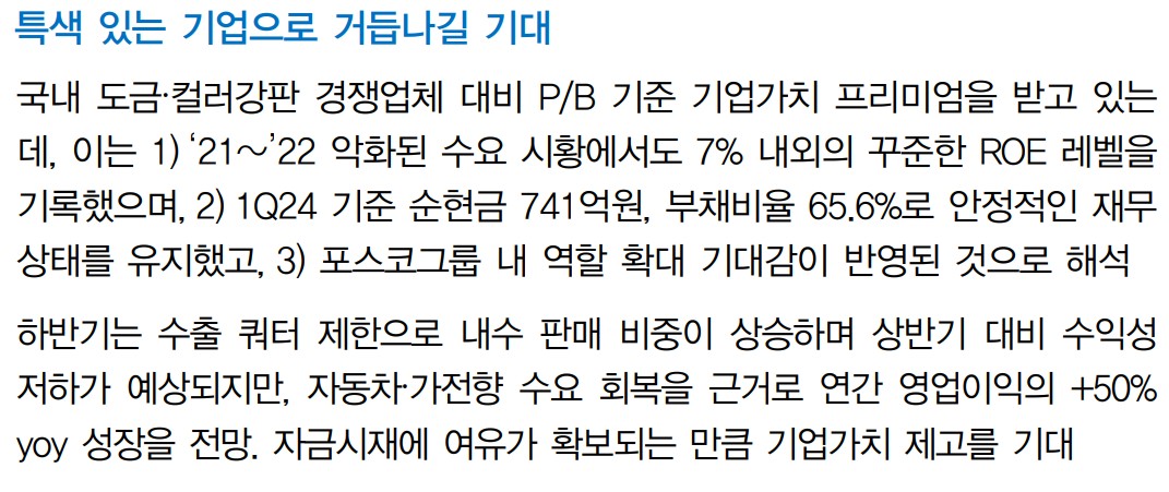 포스코스틸리온의 최근 실적과 전망을 종합해보면, 하반기 성수기와 주요 연휴 시즌에 실적 개선이 기대됨. 수출 판매 확대와 가전 부문 수요 회복으로 인해 장기적인 주가 상승 가능성이 높음. 따라서 투자의견은 매수로 유지되며, 목표주가는 50,000원으로 제시됨.