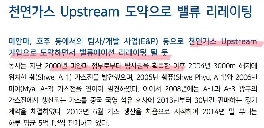 포스코인터내셔널은 천연가스 Upstream 사업 확장을 통해 장기적인 성장 가능성을 보유하고 있음. 특히, 미얀마와 호주에서의 탐사 및 개발 사업 성공이 주가 상승의 주요 요인이 될 것임. 향후 지속적인 성장이 기대되며, 주가도 상승할 가능성이 큼.