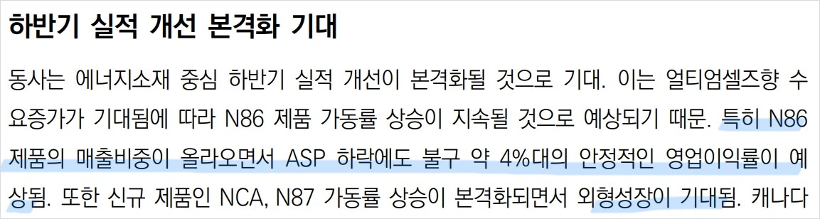 포스코퓨처엠은 하반기부터 에너지소재 중심으로 실적 개선이 예상됨. 특히, 얼티엄셀즈향 수요 증가로 N86 제품의 가동률이 지속적으로 상승할 것으로 보임. 신규 제품인 NCA와 N87의 가동률도 상승하며 외형 성장이 기대됨. 캐나다 공장은 2025년부터 매출을 시작할 예정임.