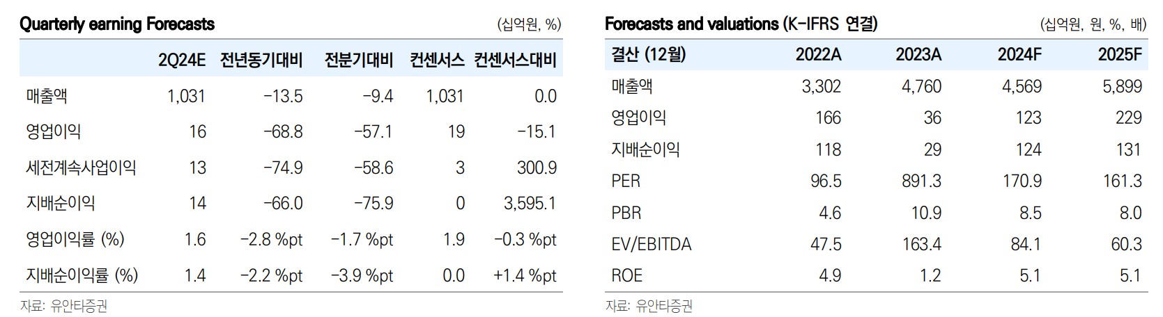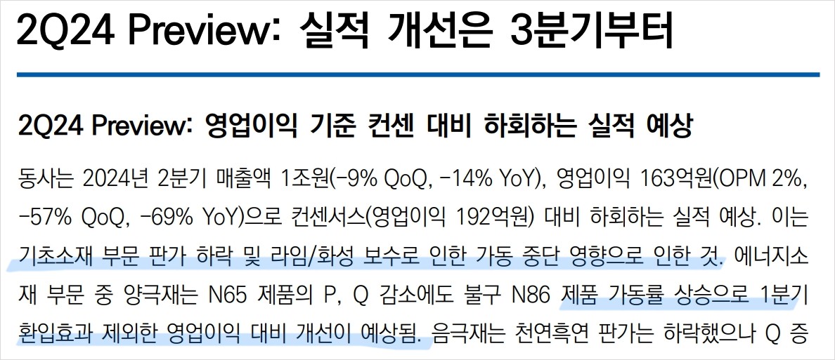 포스코퓨처엠은 2024년 2분기 매출액 1조원, 영업이익 163억원으로 예상됨. 이는 전년 동기 대비 매출액 14%, 영업이익 69% 감소한 수치임. 에너지소재 부문에서 N86 제품 가동률 상승이 긍정적인 영향을 미칠 것으로 예상됨. 하지만 라임/화성 부문 가동 중단으로 인한 영향이 실적에 부정적으로 작용함.